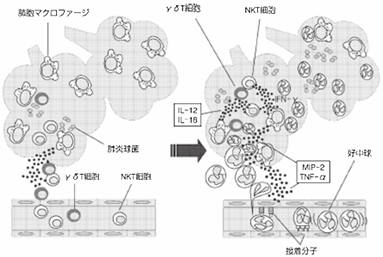 肺炎球菌は細菌性肺炎の代表的な原因菌であり、細胞外で増殖することから、その感染初期防御においては、補体や抗体によるオプソニン作用、好中球による貪食殺菌作用が重要です。肺炎球菌を経気道的にマウスに感染させた肺炎モデルを用いた実験では、感染防御に重要なエフェクター細胞である好中球の炎症局所への浸潤には、肺内NKT細胞およびγδ細胞と関連してTNFαおよびMIP-2が重要なサイトカインであることが知られています(図参照)。現在のところ、特に感染早期の肺内のTNF‐α産生に注目し、その役割および産生細胞について解析を行っています。