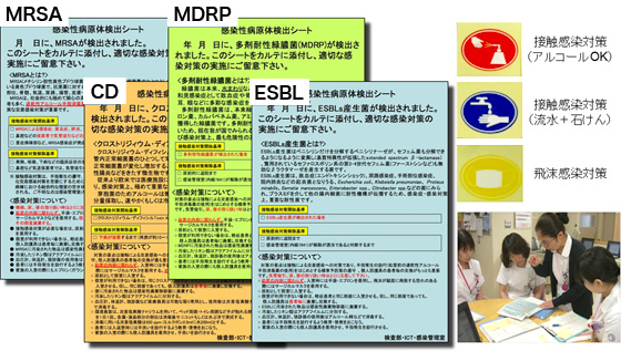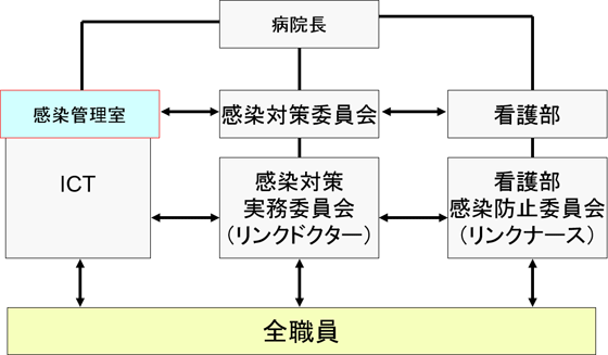 活動としては、感染対策マニュアルの策定、薬剤耐性菌が検出された場合の当該部署への注意喚起と感染対策指導、各種サーベイランスの実施、院内ラウンド、アウトブレイク対応、職員教育、抗菌薬適正使用の推進など、多岐にわたっています。 また、ICT(インフェクションコントロールチーム)を結成し、さまざまな職種・部署と連携しながら院内感染対策のより一層の充実を目指して活動しています。