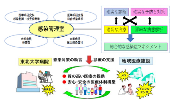 医療機関同士や高齢者施設など福祉施設との連携がますます盛んとなっていることから、院内感染を適切に予防・制御するためには、自施設内だけの対策では解決できない問題も増えてきています。私ども感染管理室は院内での活動はもとより、広く仙台市、宮城県、東北地域における感染制御・感染管理のキーステーションとしての役割を担っており、医学系研究科感染制御・検査診断学分野および総合感染症学分野とともに、“感染制御ネットワーク”を構築し、宮城県さらには東北地域において感染制御活動を実践しています。