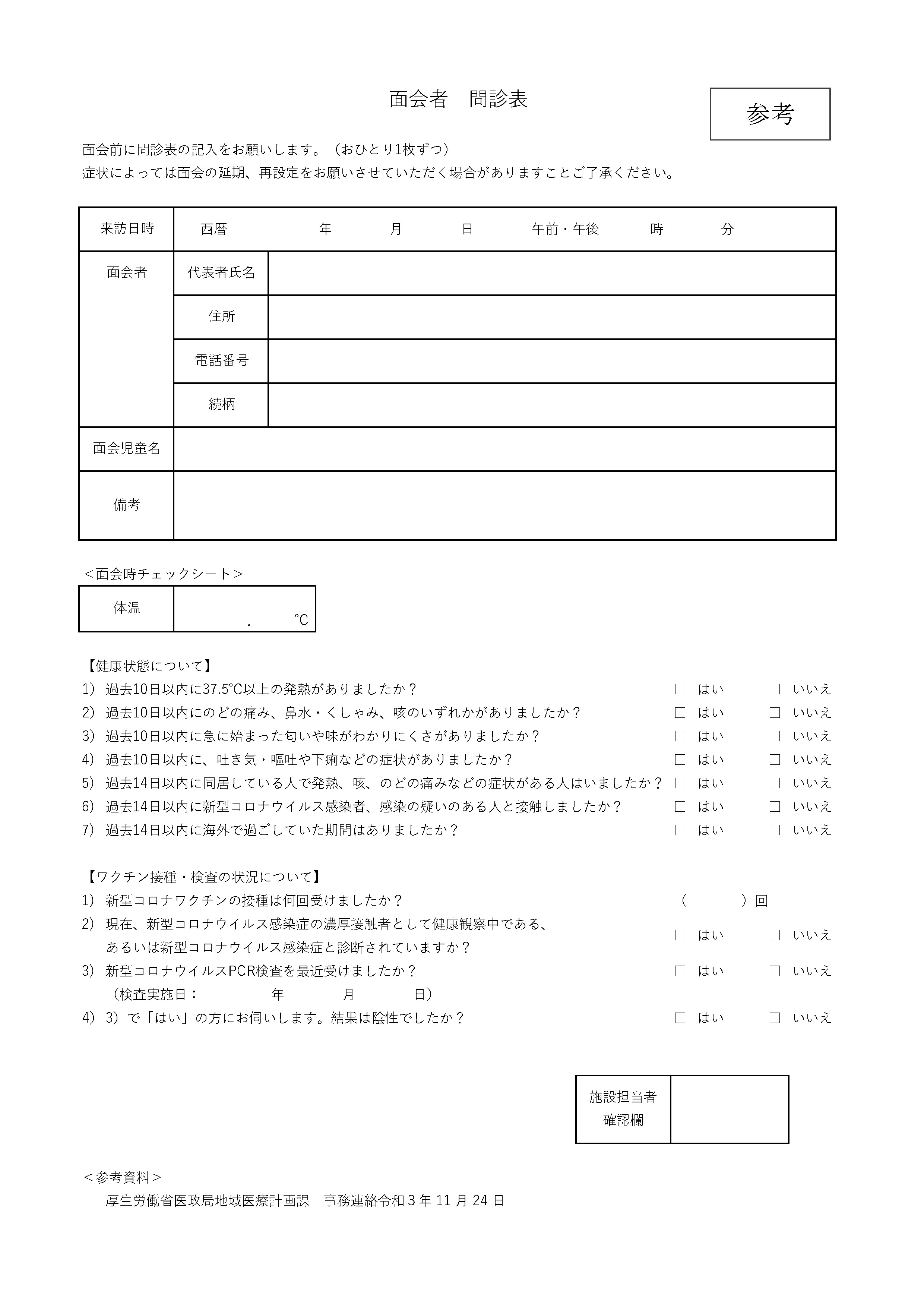 - 別添:入所型児童福祉施設における新型コロナウイルス感染症に関する対策の手引き(面会者問診表)