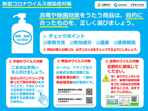 - 消毒や除菌効果をうたう商品は、目的に合ったものを、正しく選びましょう(消費者庁・経済産業省・厚生労働省)