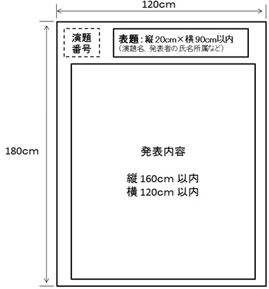 ポスター展示用パネルのサイズは、縦180cm 横120cmです。各自のパネルの左上に20×20cmの演題番号(例:P01-1)が表示されております。発表内容のポスターを縦160cm×横120cm以内で作成してください。また、タイトル用紙(演題名・発表者氏名所属など)も縦20cm×横90cm以内で作成し、パネルの最上段に提示してください。展示用の画鋲は事務局側で用意します。